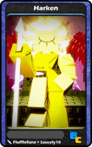 Cesus is a skin for Harken that is based on Cesus from The Battle Bricks. It gives Harken a white skin tone, gives her a retro stud-esc look, gives her black pants, a blue shirt with a teapot on it and changes her head into a white teapot wearing black earphones, it also gives her a large gravity hammer on her back. When enraged her skin will turn light blue, with her shirt and pants turning dark blue. This skin has a custom Tangle Spear and a custom Immolate and Intro animation. This skin can only be unlocked by beating chapter 4 in The Battle Bricks (so the whole base game not counting sub-chapters, 2 and 3 star difficulty and tumor mode).