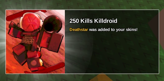Deathstar is a mastery skin for Killdroid that’s unlocked by killing 250 civilians with him. It turns Killdroid’s body mostly white, gives him a shirt with (void *) written on it, two space looking cannons on his shoulders and makes his head into a see through glass orb with a floating energy core in it. It also makes his killbots grey and gives them a blank expresion.