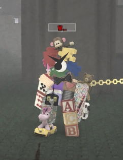 Mr. Screwy is a skin for Harken that makes her look like a bunch of toys. This skin makes her consist of many different toys like cards, toy vehicles, plushies, alphabet blocks. It also makes her head into four differently colored puzzle pieces with a big googly eye on them, and gives her a sleeping princess on her right shoulder. When enreaged the puzzle pieces unattcach from each other, the princess wakes up and a giant angry eyebrow appears above the googly eye. This skin also has a lot of custom sound effects, those include ones for: